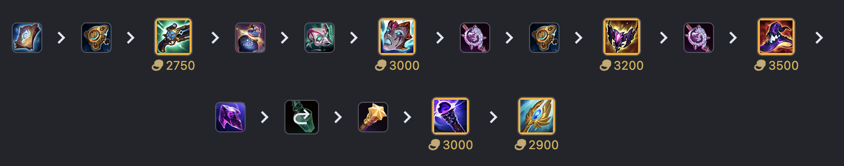 첫 번째 템으로는 마나 관련 템인 '루덴 or 횃불'을 추천드립니다. 다음 템들은 유동적으로 돈이 되는 데로 가시면 됩니다. 만약 돈이 많이 모인다면 바로 라바돈의 모자를 가도 무방합니다.