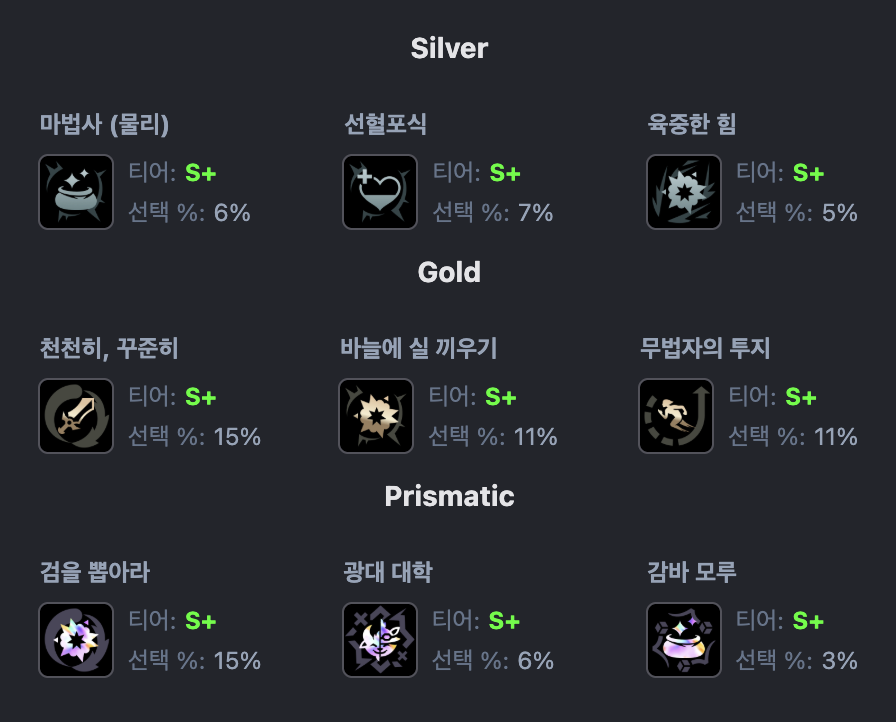 나머지 증강은 상황에 따라 '피흡, 공격력, 방관'과 관련된 증강을 선택하시면 됩니다.