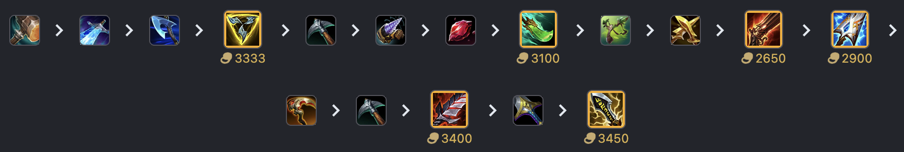 스몰더는 다른 원딜들과 달리 템 트리도 독특합니다. Q로 스킬딜이 메인이기 때문에 트포와 쇼진의 창을 먼저 가주시면 좋습니다.