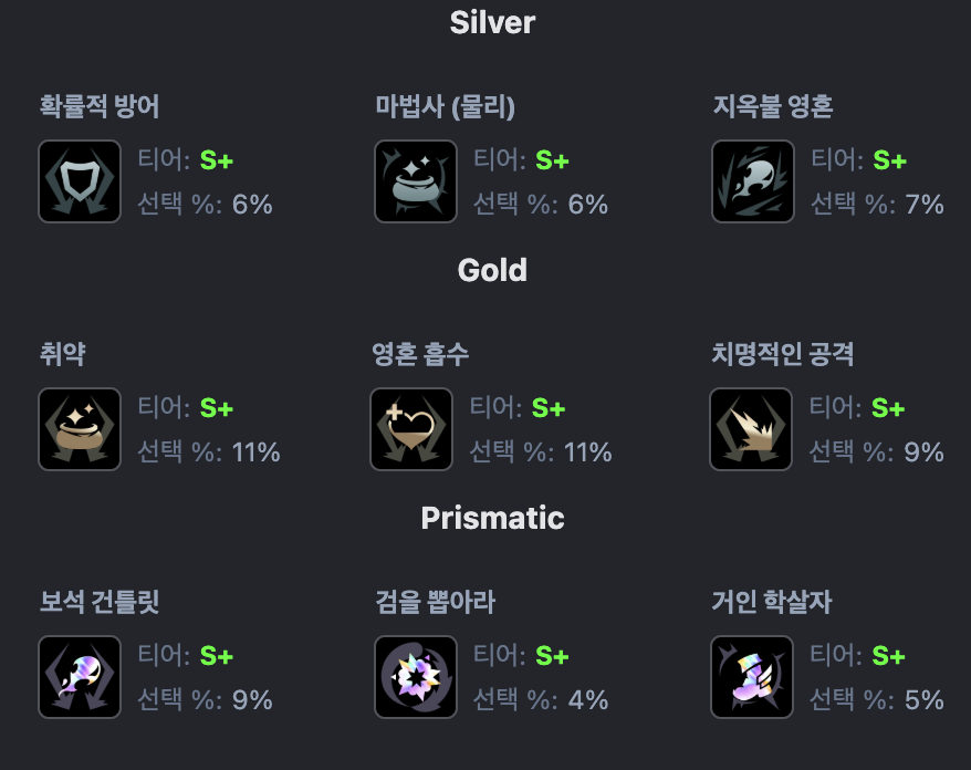검을 뽑아라 증강도 '이속, 공속, 피흡 등'을 올려주기 때문에 평타 딜을 하지 않아도 되는 스몰더에게 최고의 증강입니다. 사실상 AD 스킬딜러라고 보시면 됩니다.
