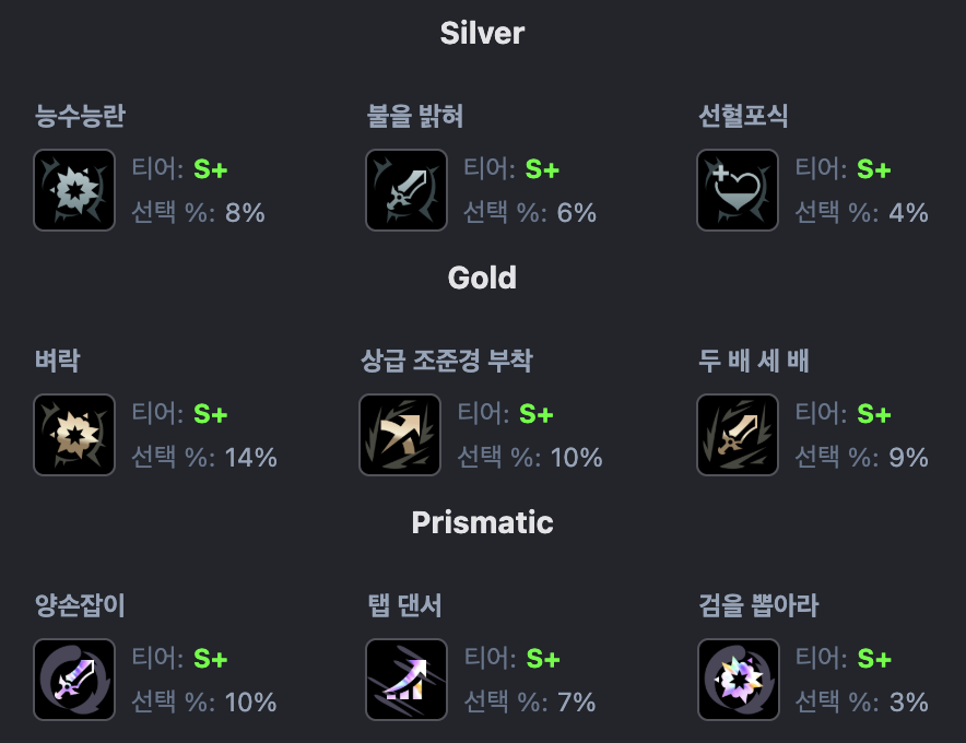 '검을 뽑아라 -> 조준경 -> 조준경' 정확히 이 순서로 먹어야하기 때문에 조건이 까다롭습니다. 첫번째 증강에서 플래티넘이 나왔다면 한 번 시도해보시면 좋을 것 같습니다.